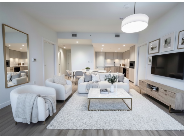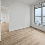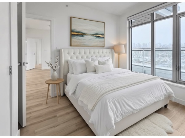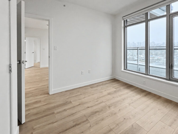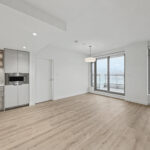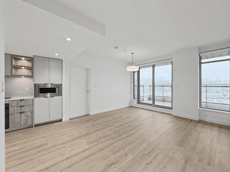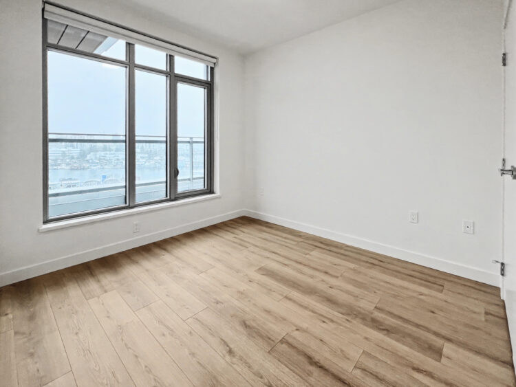 Expansive windows frame east-facing views toward the water, mountains, and Harbourside area, while a covered balcony provides a quiet place to enjoy the surroundings. The interiors reflect a contemporary West Coast aesthetic with natural tones, wide-plank flooring, and quality finishes.